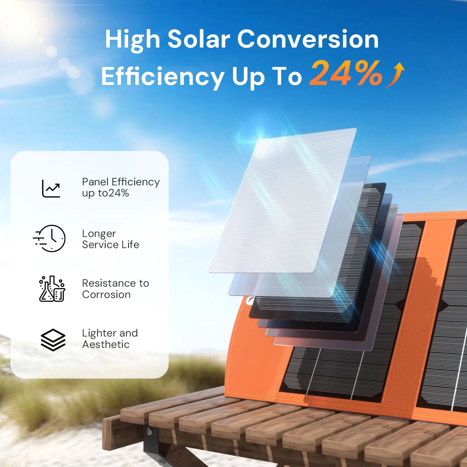 【Higher Solar Conversion】 Upgraded folding solar panels convert up to 24% of solar power into free energy in enough sunlight, at standard test conditions, it can fully charge a 5000mAh mobile phone in two hours. SOLUPUP uses a special polymer surface to protect backpack solar panels from occasional rain or wet fog ( The junction box is not waterproof)